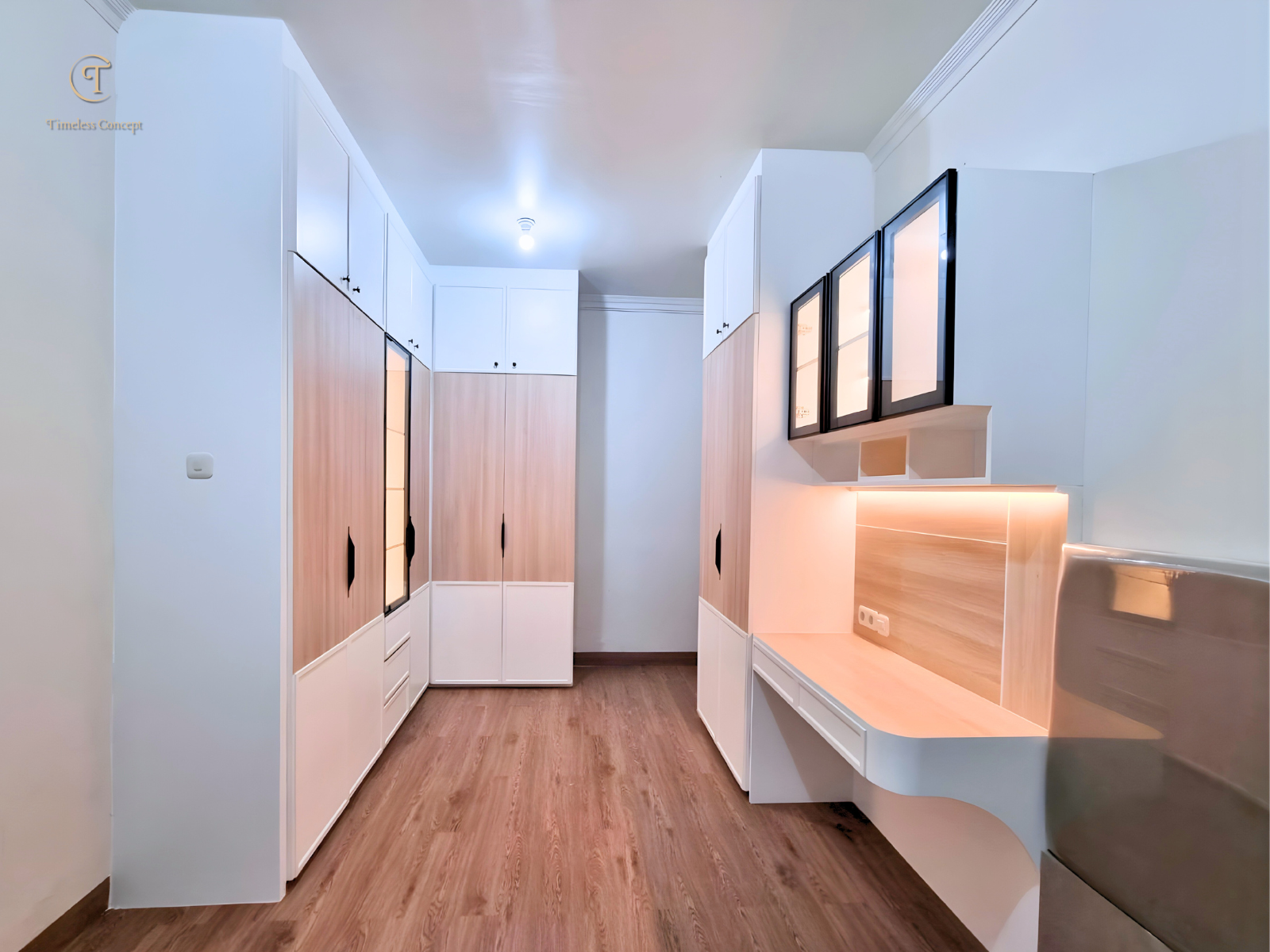 Selain fungsi utama, kami juga menyisakan ruang untuk dekorasi personal klien seperti lampu meja favorit, tanaman kecil, atau pajangan dekoratif tanpa mengganggu kesan minimalis kamar. Ini membuat ruangan tidak hanya fungsional, tetapi juga mencerminkan karakter dan gaya hidup klien.