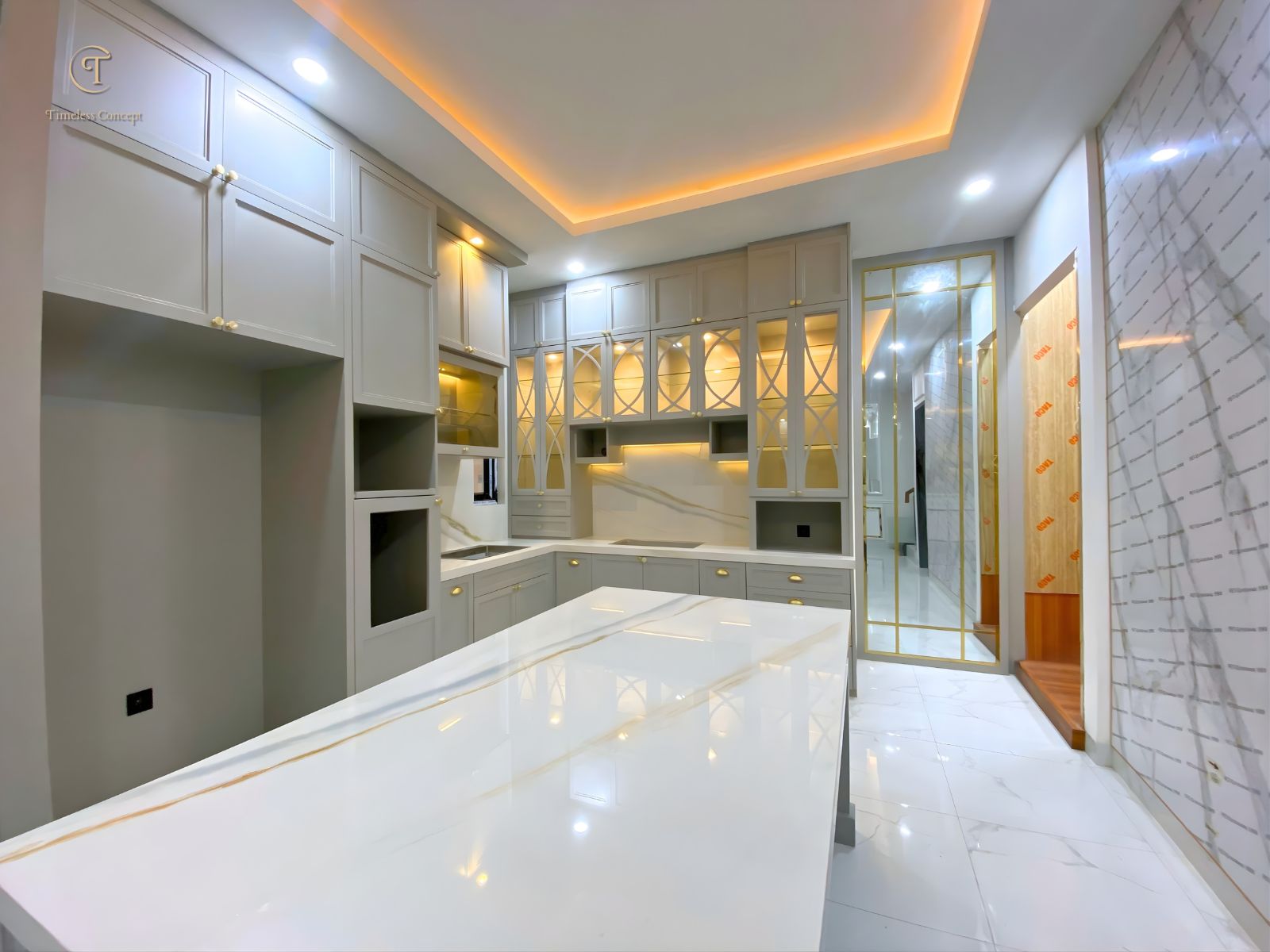 Desain ini tidak hanya soal tampilan, tetapi juga penataan yang efisien. Area memasak, meja kerja, dan storage diatur agar aktivitas sehari-hari—memasak, menyiapkan makanan, atau sekadar menata peralatan menjadi nyaman dan menyenangkan.
