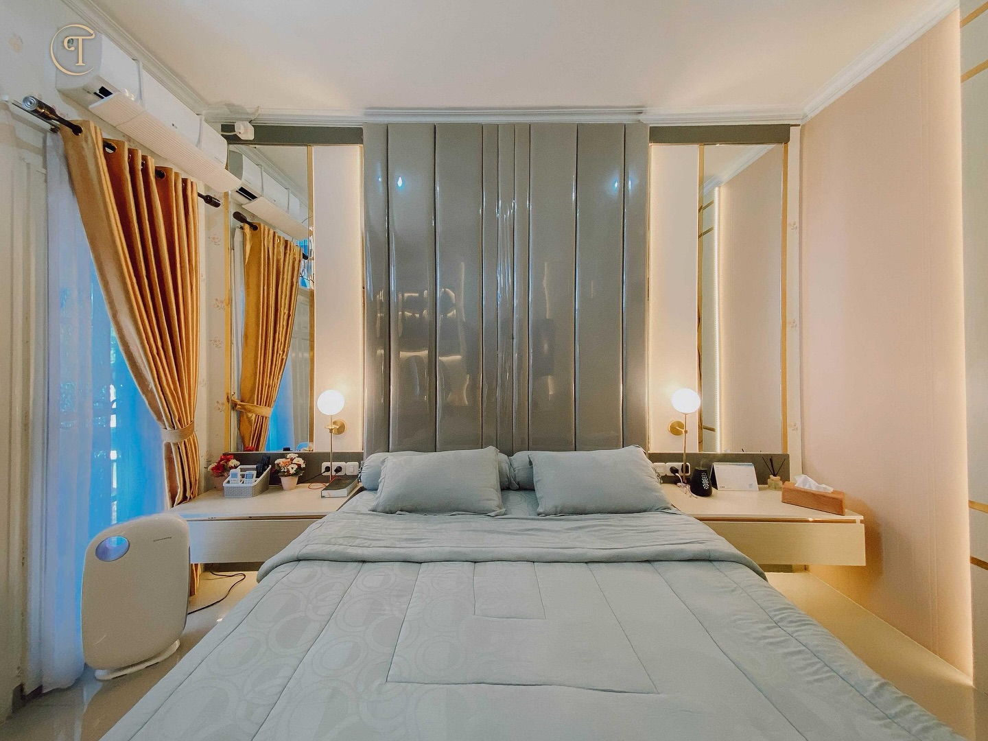 Kombinasi panel marmer, aksen gold, dan warna beige lembut memberikan karakter modern luxury tanpa terlihat berlebihan. Material glossy pada headboard juga memberi pantulan cahaya yang membuat ruangan terasa lebih luas dan berkelas.