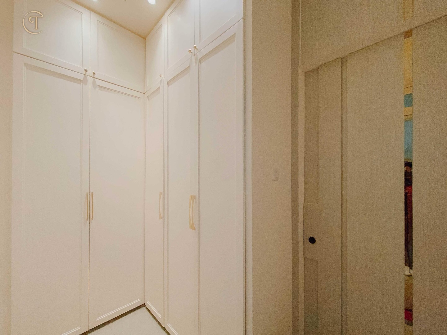 Kabinet penyimpanan tersembunyi di balik panel kayu berfungsi menyimpan kebutuhan pribadi tanpa mengganggu estetika ruangan. Semuanya tertata, tanpa terlihat kaku.