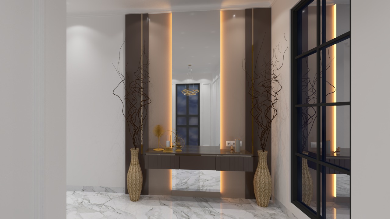 Untuk menambah nilai estetika, digunakan aksen gold pada beberapa elemen seperti list dinding, lampu, atau dekorasi kecil. Sentuhan emas ini memberikan kesan mewah tanpa membuat ruangan terasa berlebihan. Justru, warna gold bekerja sebagai highlight yang menonjolkan detail desain dan menambah dimensi visual dalam ruangan.