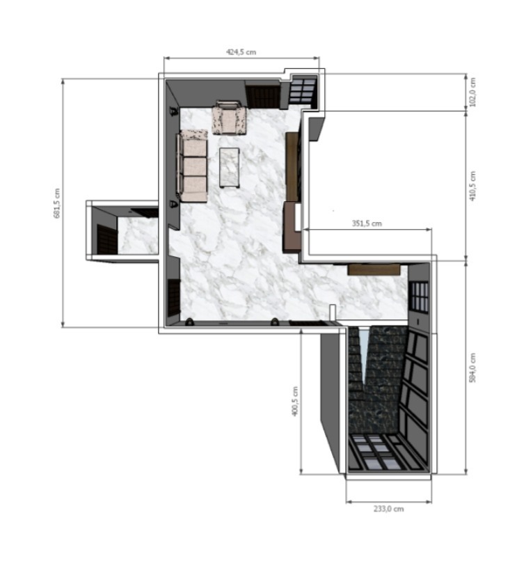 Pada desain ruang tamu ini, warna coklat tua dijadikan sebagai dasar untuk memberikan kedalaman dan karakter. Warna ini kemudian diseimbangkan dengan coklat muda yang membuat ruangan terasa lebih lembut dan terang. Hasilnya adalah ruang tamu dengan nuansa hangat, modern, dan sangat homey.