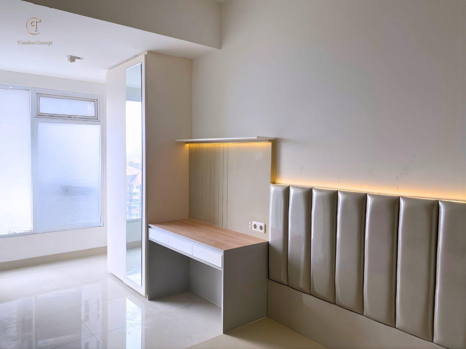 Terintegrasi dengan headboard, meja ini memberikan fungsi ganda baik sebagai meja rias maupun meja kerja. Desainnya sederhana dengan laci ramping serta lampu LED di bagian bawah rak, menjadikannya area yang nyaman untuk bekerja maupun merias wajah.