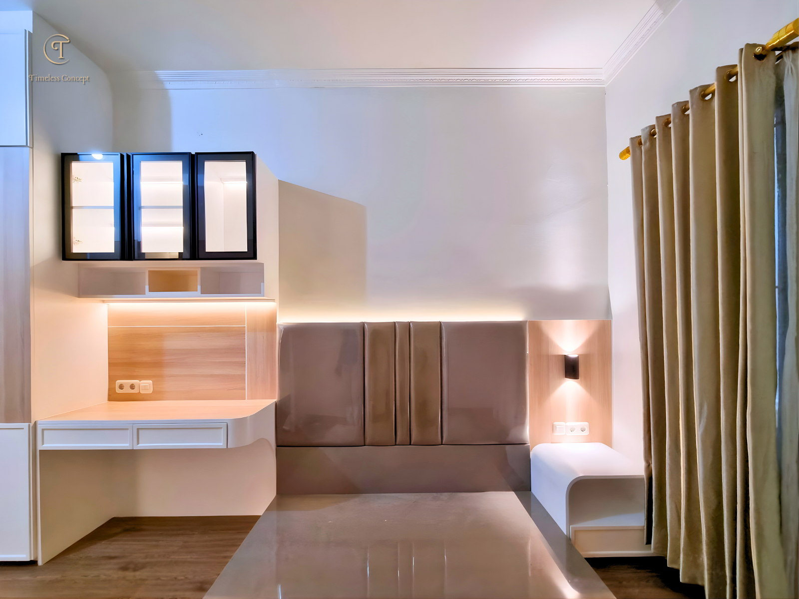 Kamar minimalis bernuansa putih dengan sentuhan HPL, dirancang sebagai ruang yang tenang untuk beristirahat sekaligus produktif untuk bekerja.