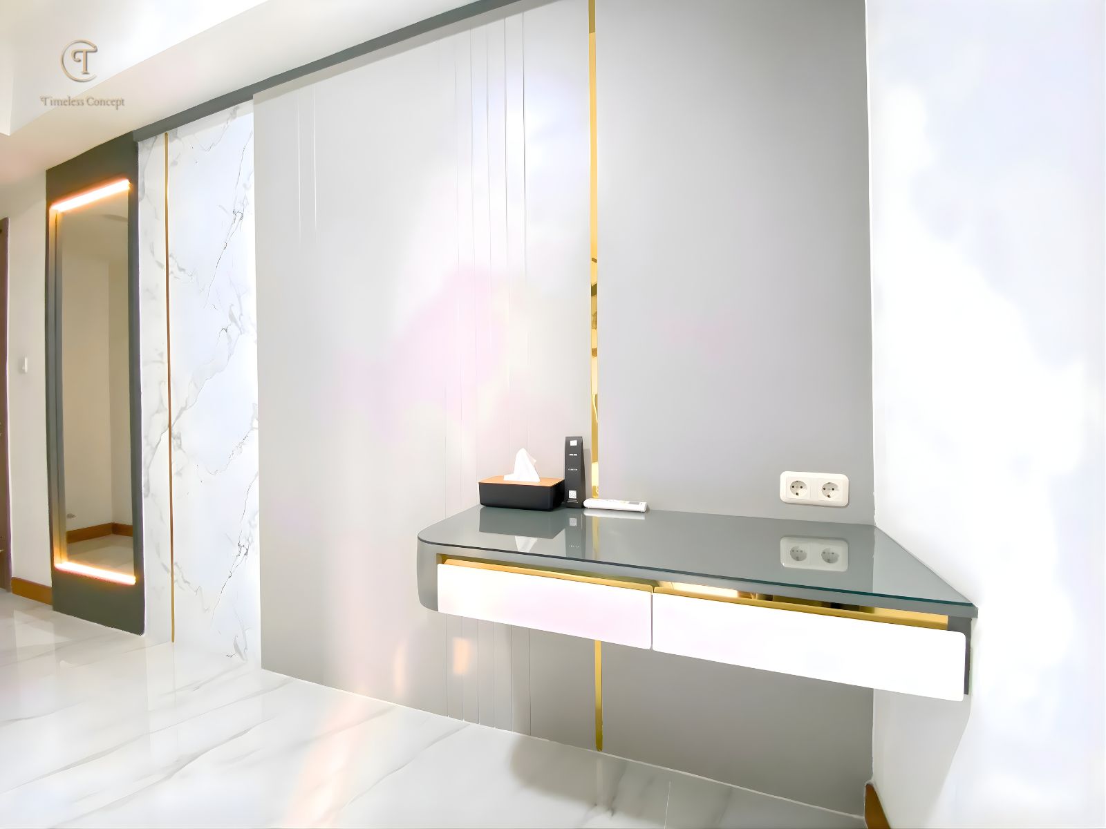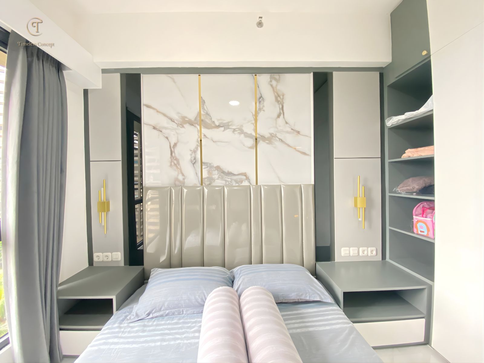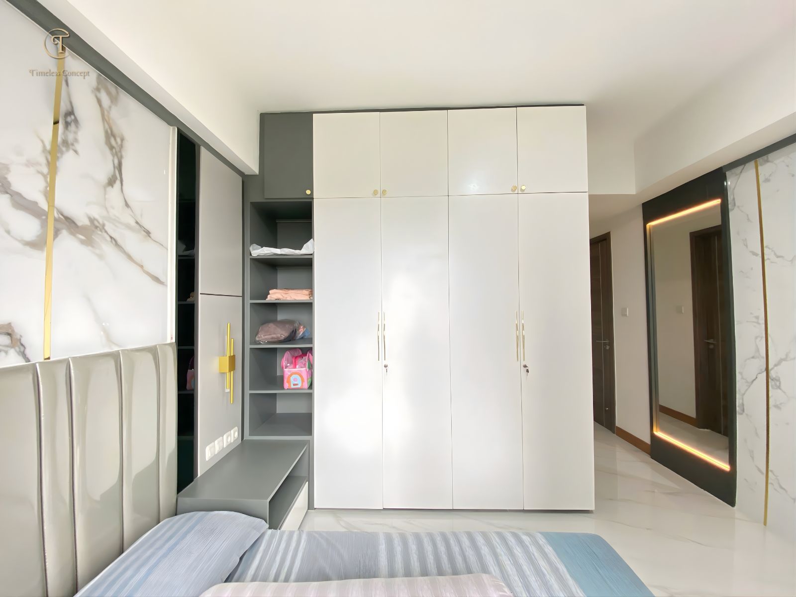 Master bedroom ini menghadirkan nuansa modern luxury melalui kombinasi panel marble, aksen gold, serta wardrobe built-in yang sleek dan fungsional. Setiap elemen dirancang clean, terang, dan berkelas, menciptakan ruang istirahat yang nyaman sekaligus estetis.