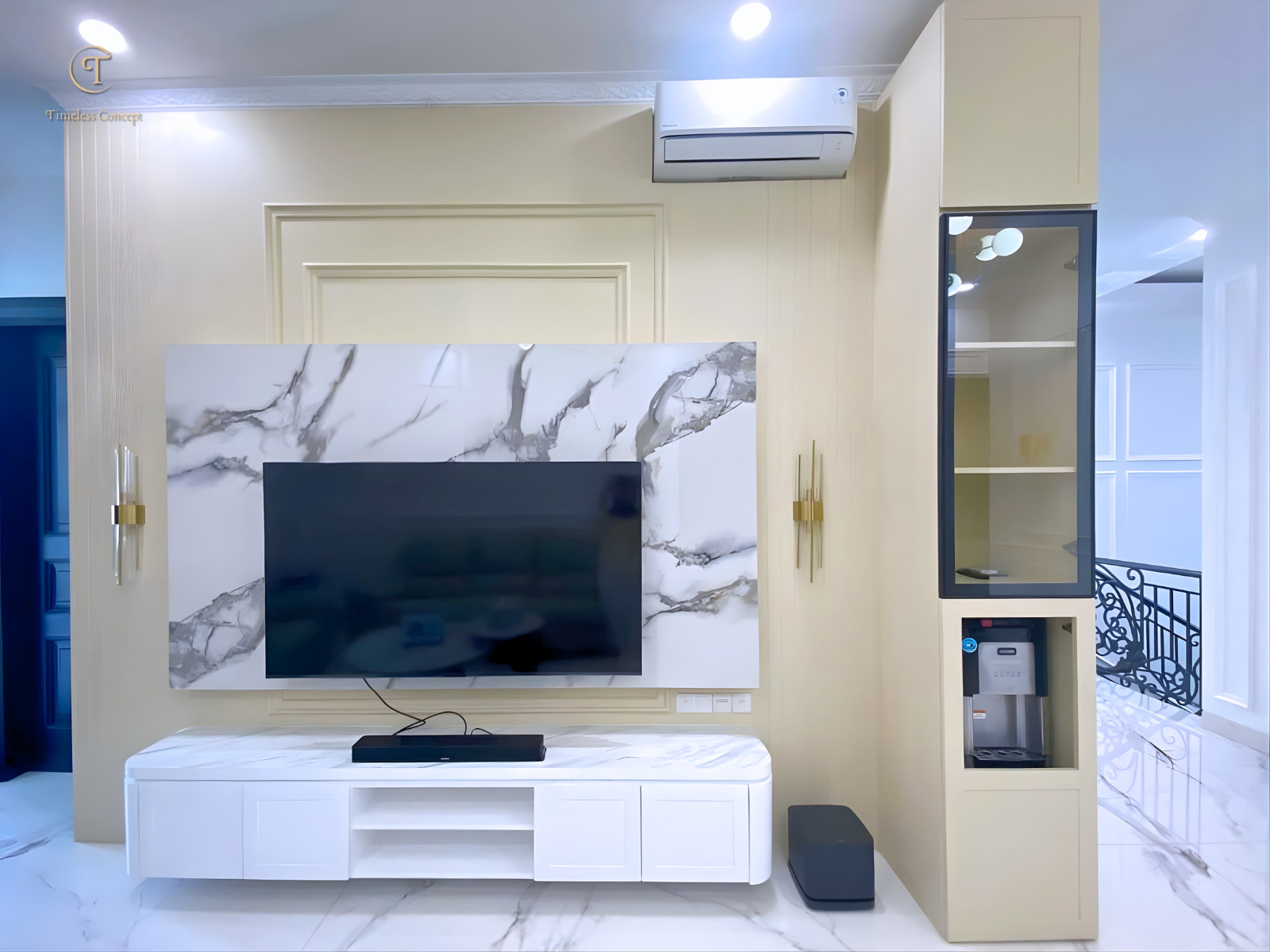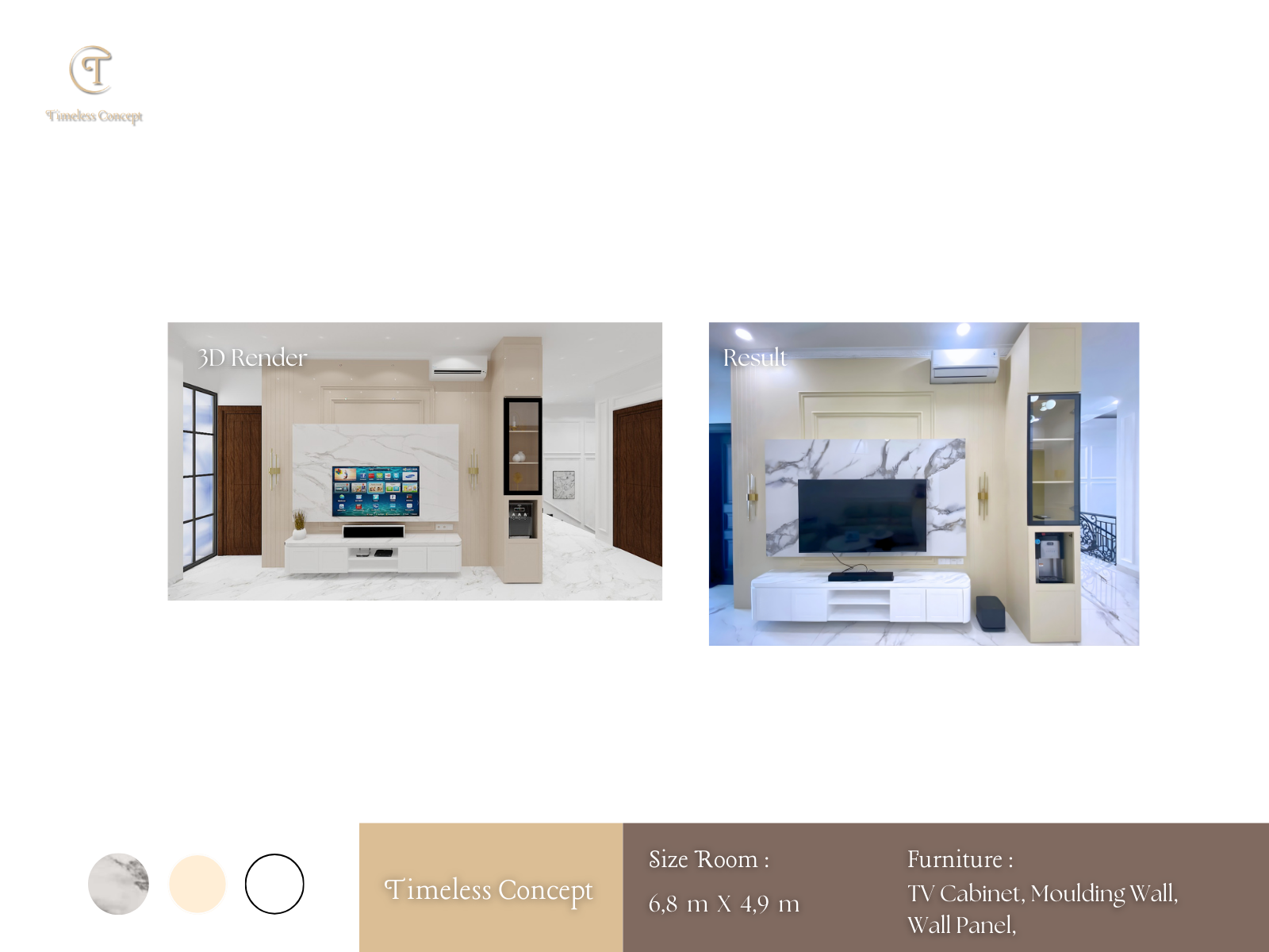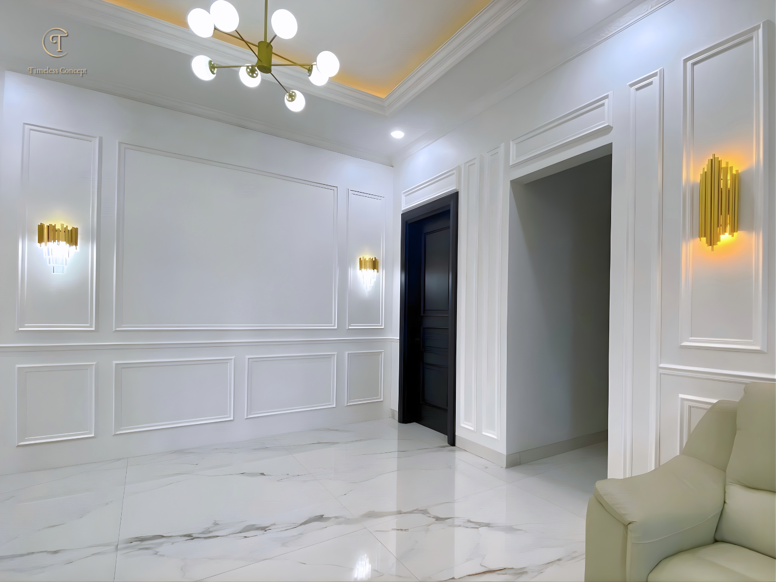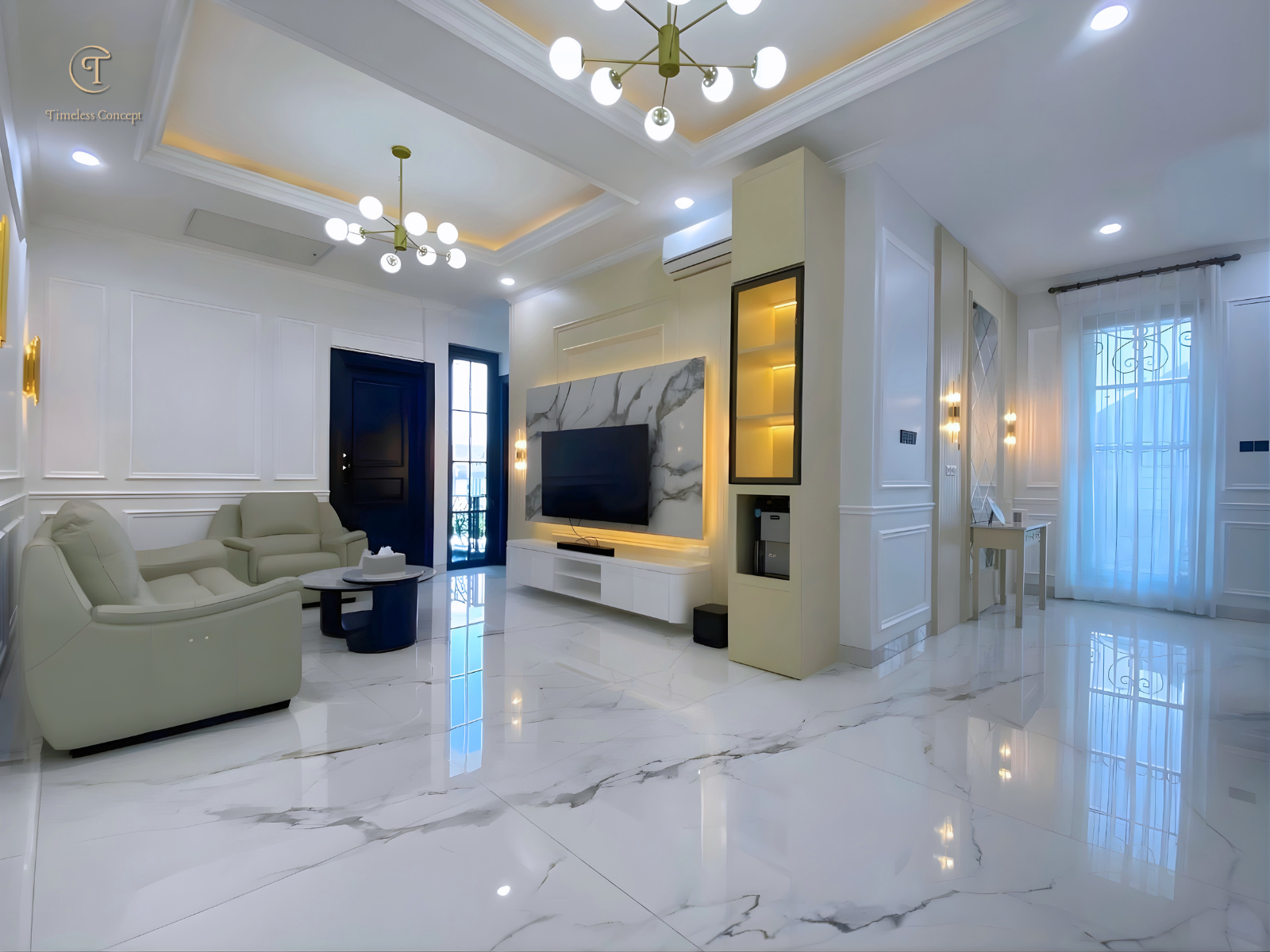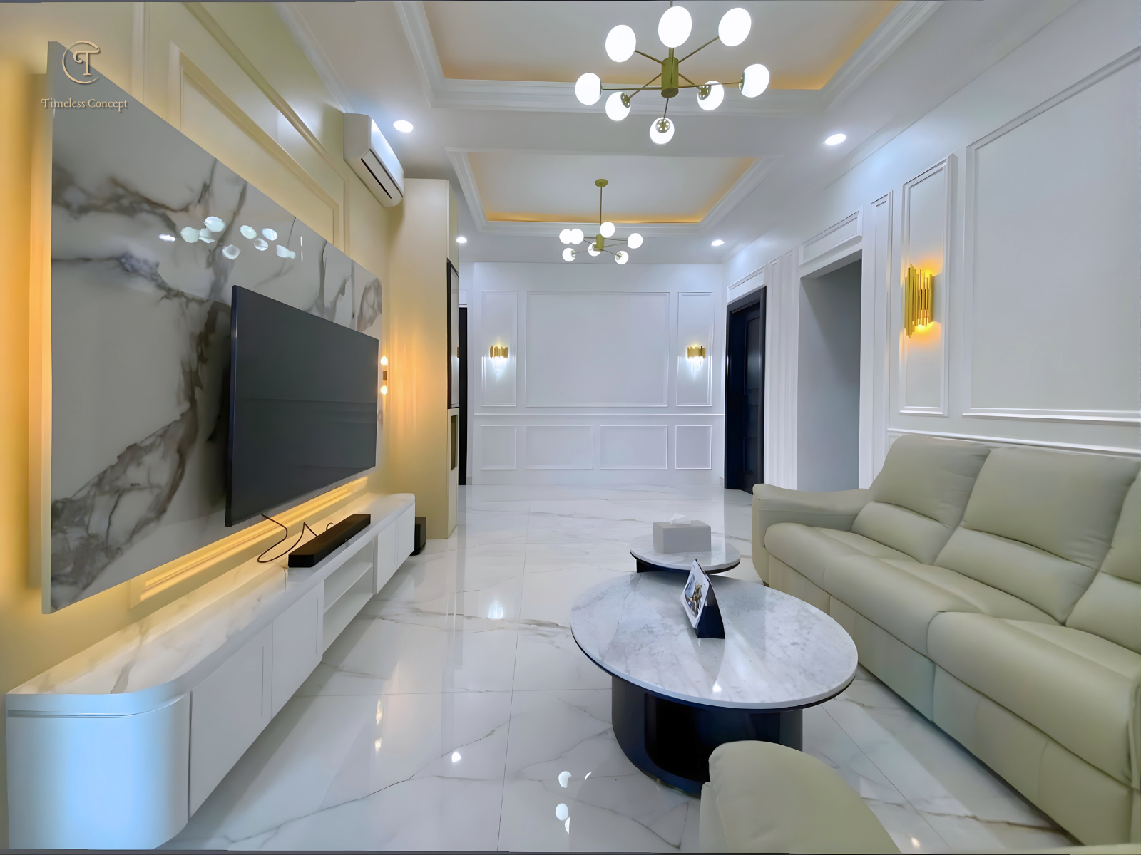 Ruang keluarga ini dirancang dengan konsep modern classic yang memadukan marble TV wall, panel dinding elegan, serta pencahayaan warm light yang menciptakan suasana mewah namun tetap hangat untuk berkumpul bersama keluarga.