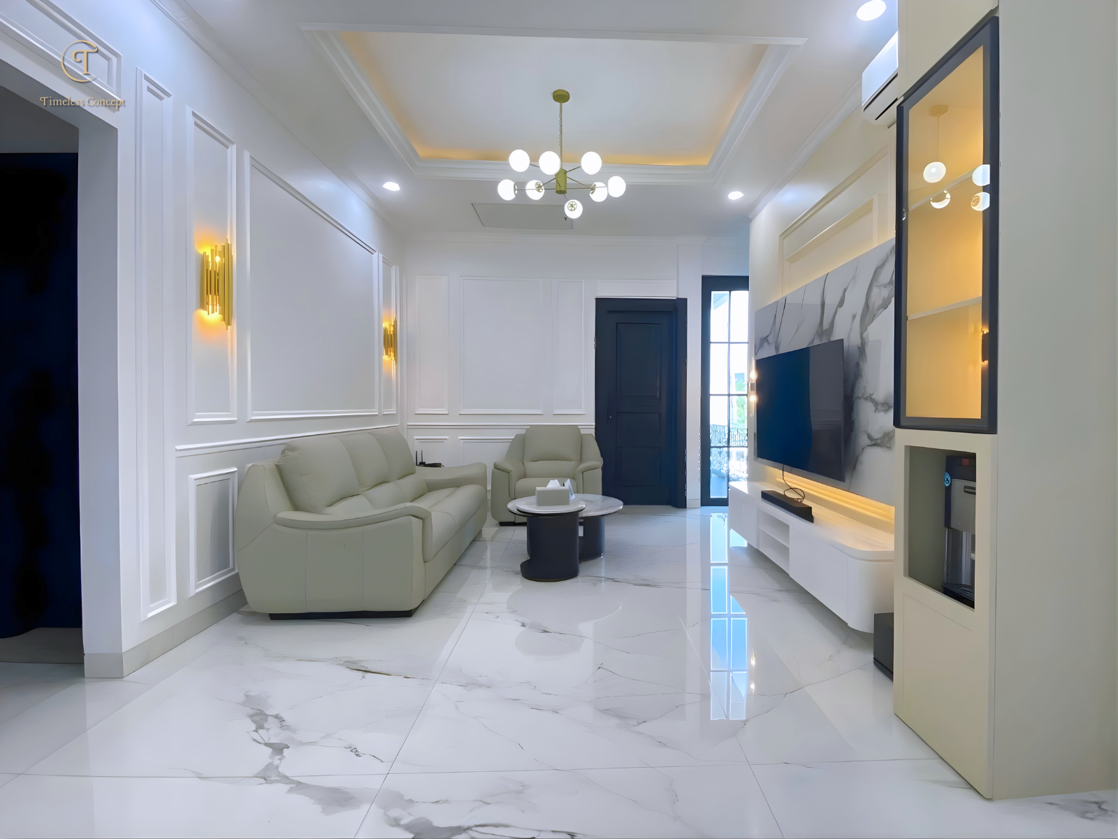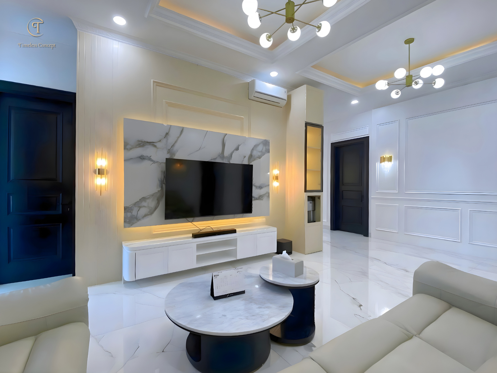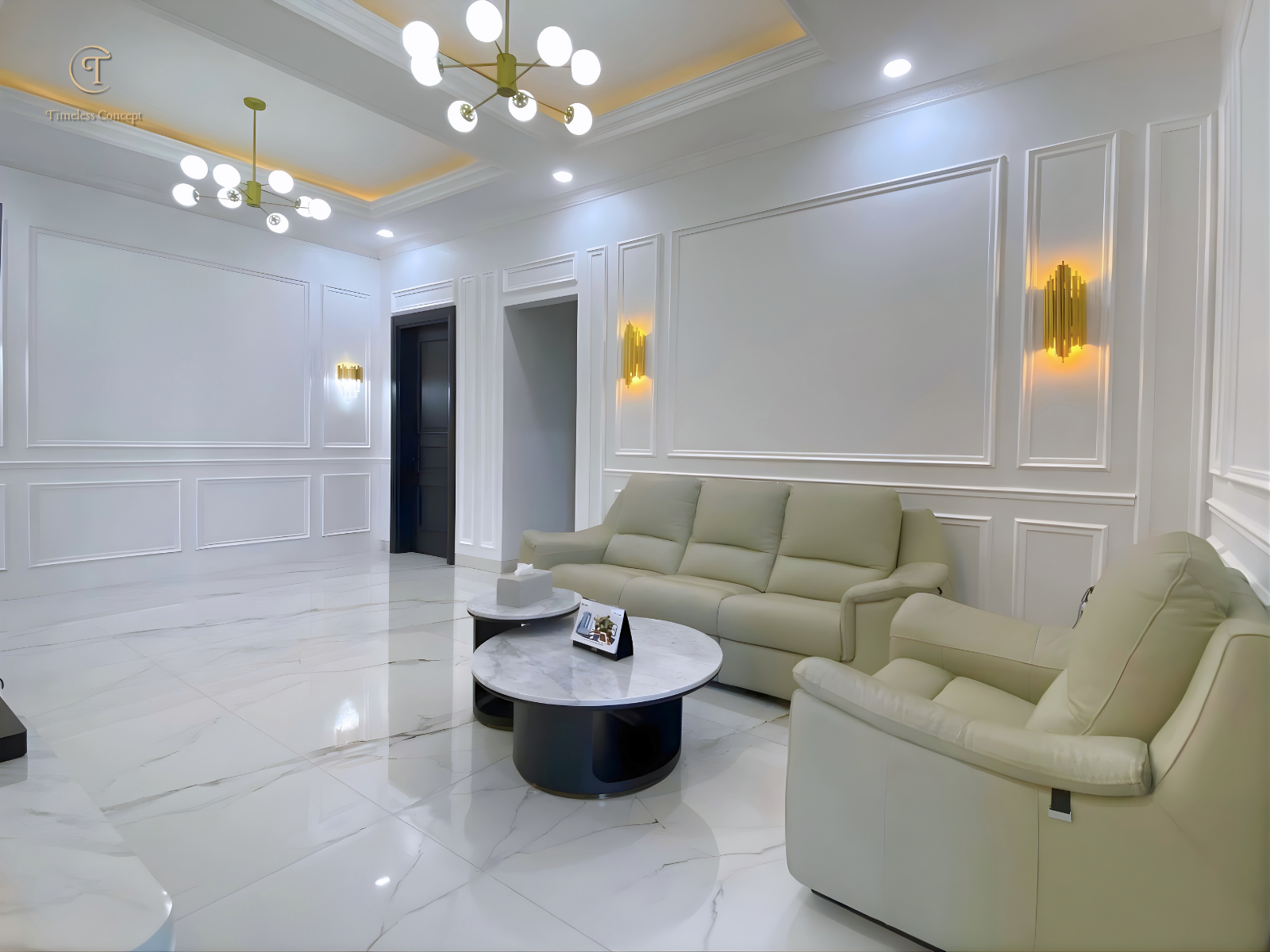 Elegant Living Room with Marble Touches & Warm Lighting that Creates a Luxurious and Comfortable Atmosphere
