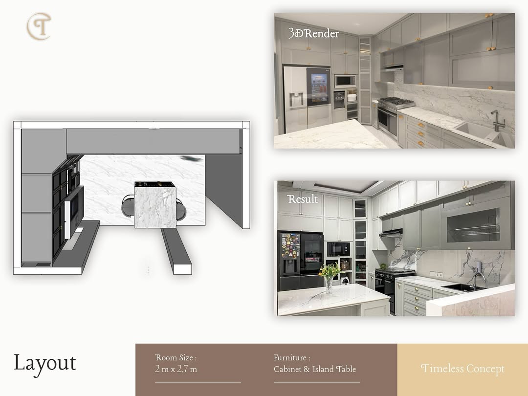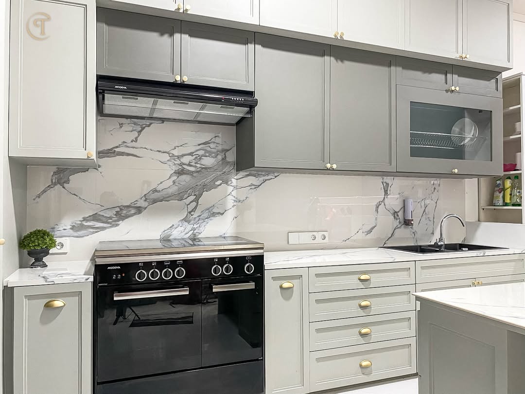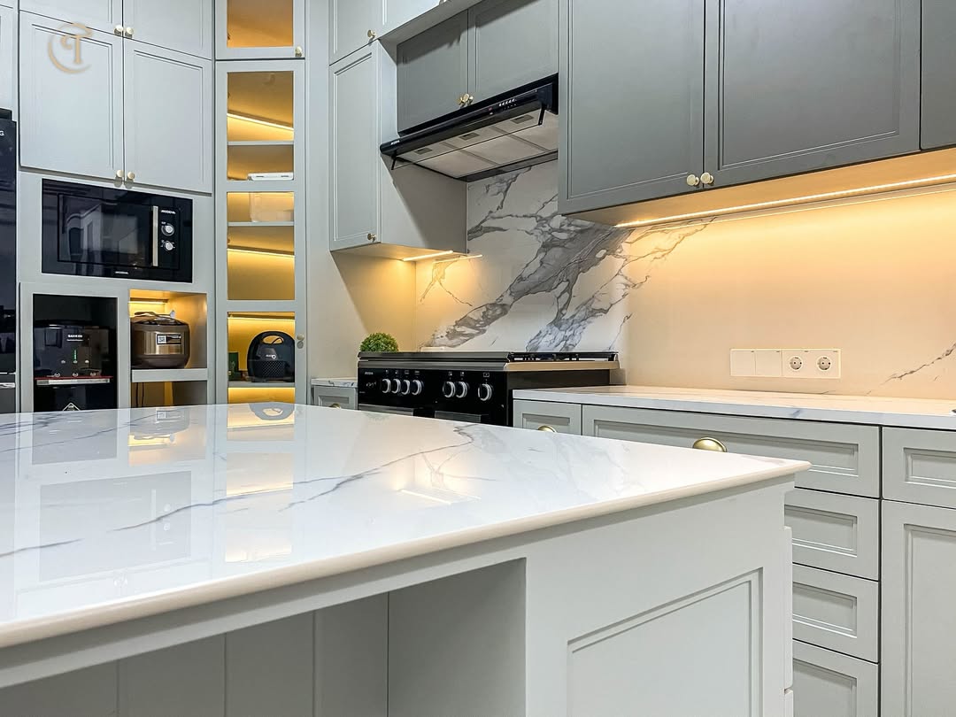Dapur modern minimalis ini mengusung konsep kabinet tinggi dengan sistem penyimpanan maksimal, dipadukan dengan finishing marmer pada backsplash serta meja island yang elegan. Warna netral pada kitchen set menciptakan kesan luas, sementara penempatan peralatan modern membuat dapur tetap fungsional dan efisien.